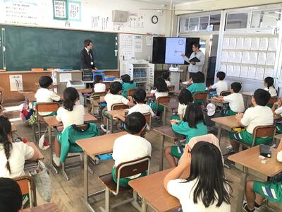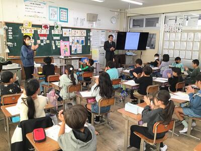 栄養指導です。市の給食調理場から栄養教諭の先生をお招きしての授業です。