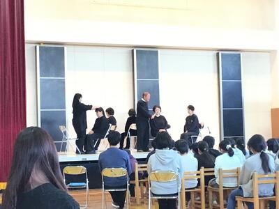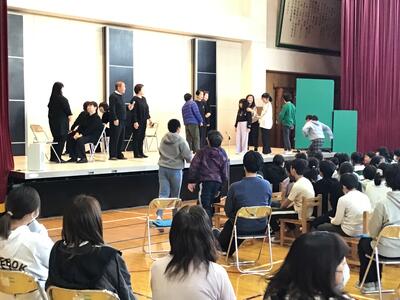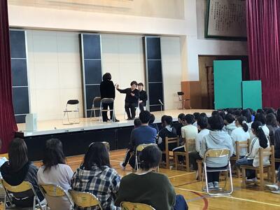 実際にあったいじめを題材にして、その場面を再現し、それを見ている皆さんと一緒に考えていく形で進められます。普通の演劇と違うのは、役者は演じるだけでなく、その役の本人として、丸山先生や参加者の質問に答えるところです。