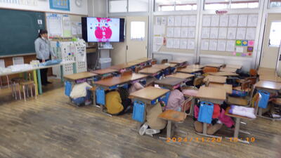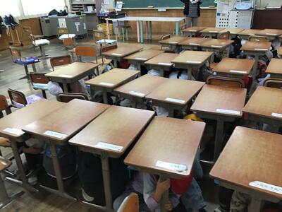 職員室で竜巻発生の放送が行われてから、すぐに教室の方に行ってみると避難行動が完了していました。なかなか素早い行動ができました。