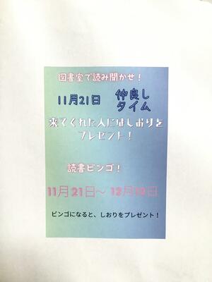 読書の秋ですから、図書委員会も活躍中です。廊下の角にポスターがあります。今日のなかよしタイム(昼休み)のイベントのお知らせでした。