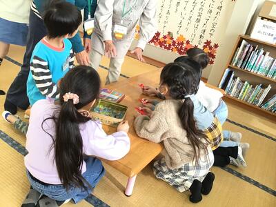 いろいろな場所でいろいろな遊びが用意されているのを子供たちが交代で回っていきました。下の写真は、「おはじき」です。