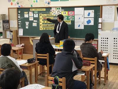 栄養指導です。市の給食調理場から栄養教諭の先生をお招きしての授業です。