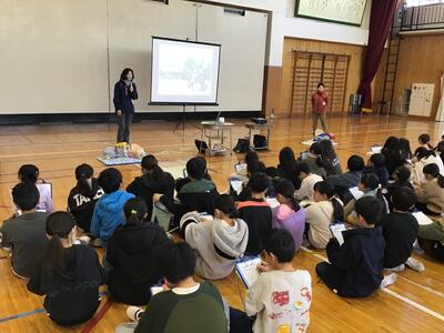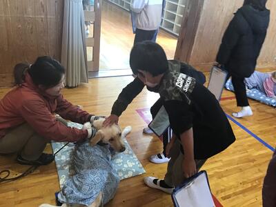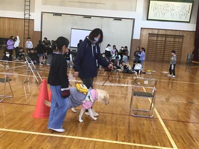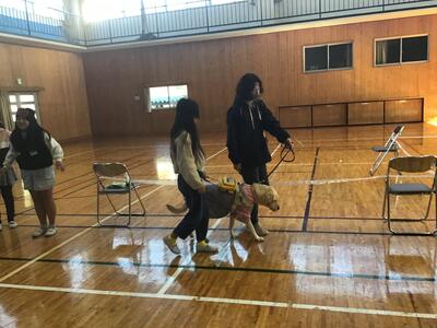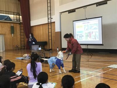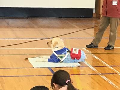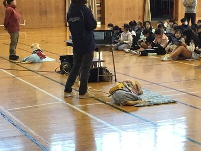 4年生、盲導犬体験です。盲導犬協会から2匹の盲導犬と、講師の先生方が来てくださいました。