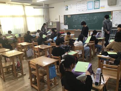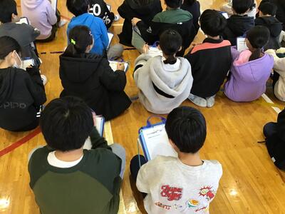 アイスブレイクから始まり、6年生が書いたパンフレットを中学生が講評するという交流を行いました。
