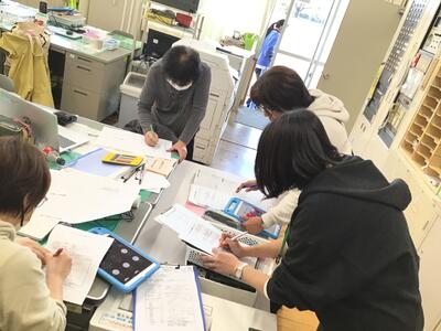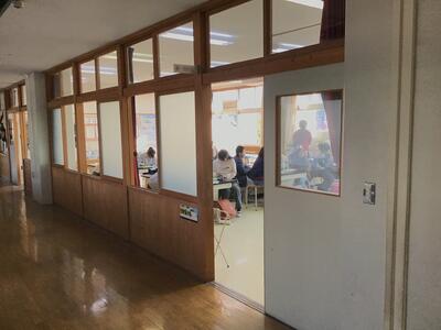給食ボランティアの皆様と給食試食会を行いました。配送されコンテナに入っている給食を、各学級に運ぶために振り分け、各階に届ける仕事をしてくださっています。数も多く3階まであるので、なかなか大変です。