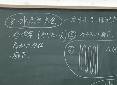 「水ぶき大会」とか書いてありますね。「水ぶき」は普通「大会」とはつながらない単語のはずですが・・・。子供たちに聞くと計画委員会とのことですので、楽しい企画を案出している途中なのでしょう。