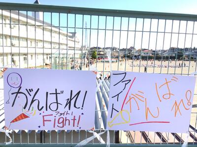 2学期最終日 朝のあいさつ運動はいつも通り、このところこのような横断幕が登場してさらなる盛り上がりを見せています。