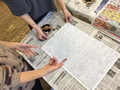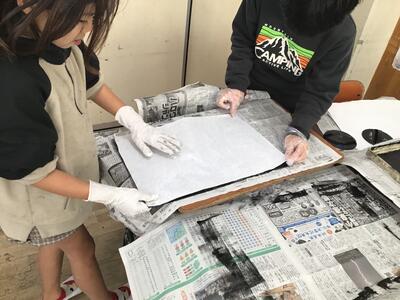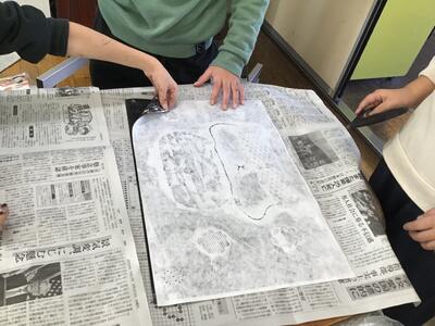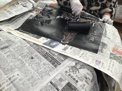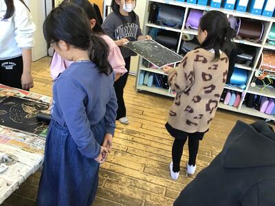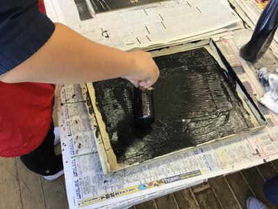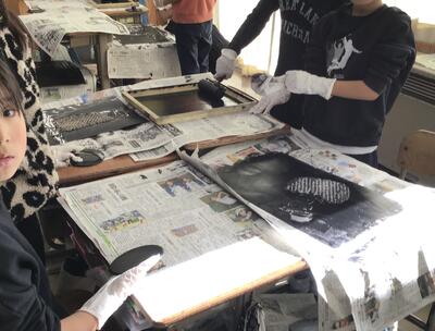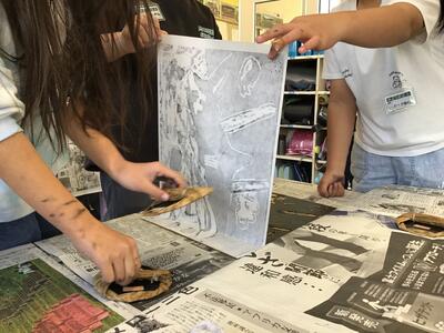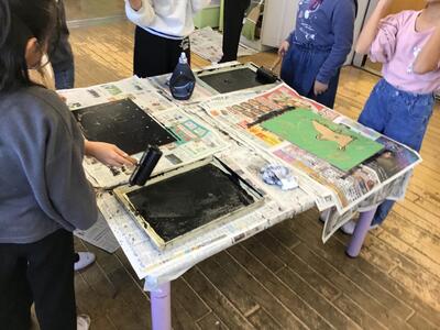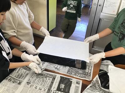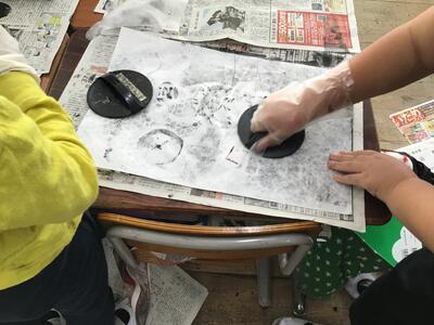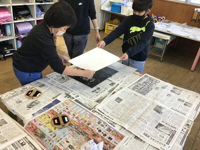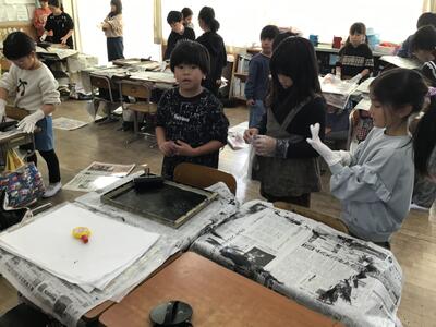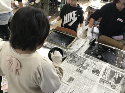 「彫り」の作業が終わり、「刷り」に入った4年生です。