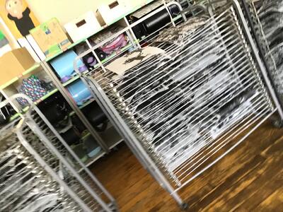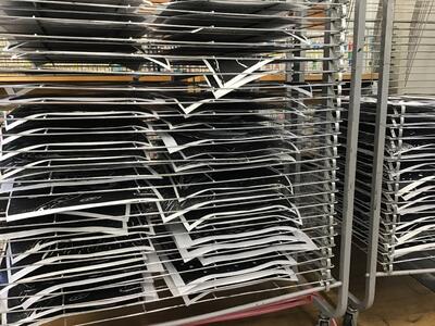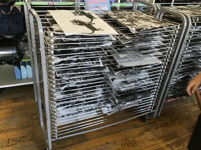 油性のインクは、しばらくべたべたしているので刷り上がったらすぐに乾燥棚に収納します。