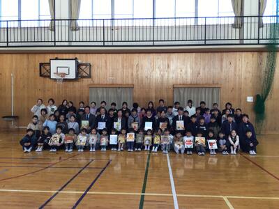 最後にみんなで記念写真。送られた絵本を持ってにっこり。