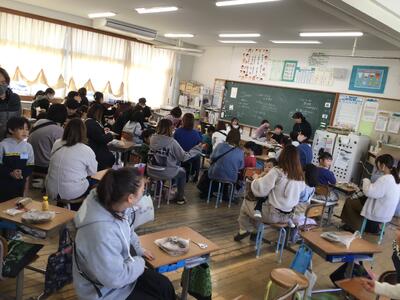 もち米の栽培を教えてくださった地域のボランティアティーチャーの方にも来ていただきました。おかげさまで、おいしいおにぎりが完成します。ありがとうございました。