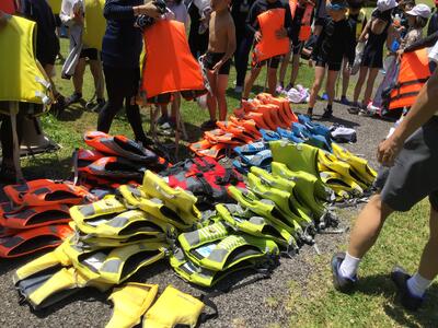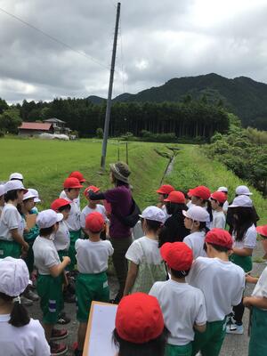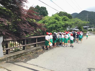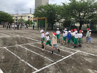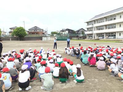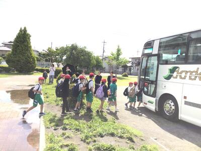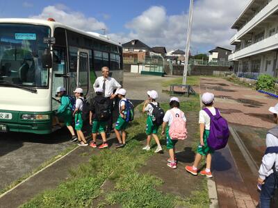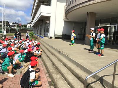 1年生が何やら並んでいます。今日は2組さん、水泳体験に出発です。