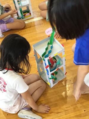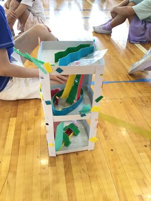 上の方からビー玉を転がすとうまく枠や橋などを渡り下の方にあるゴールまで転がっていくというゲーム的作品です。教材のタイトルは「ビー玉大冒険」とのことでした。