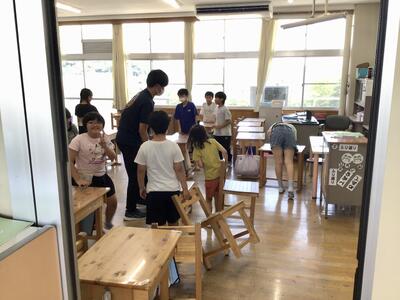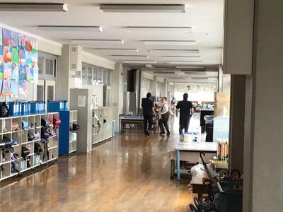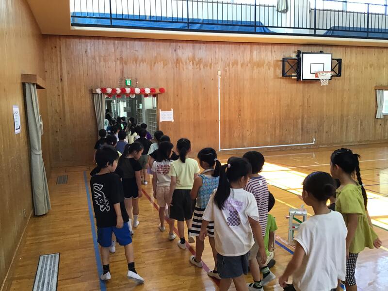 2年生が教室に戻り、集合する5年生たち、ほっとしたような表情で、