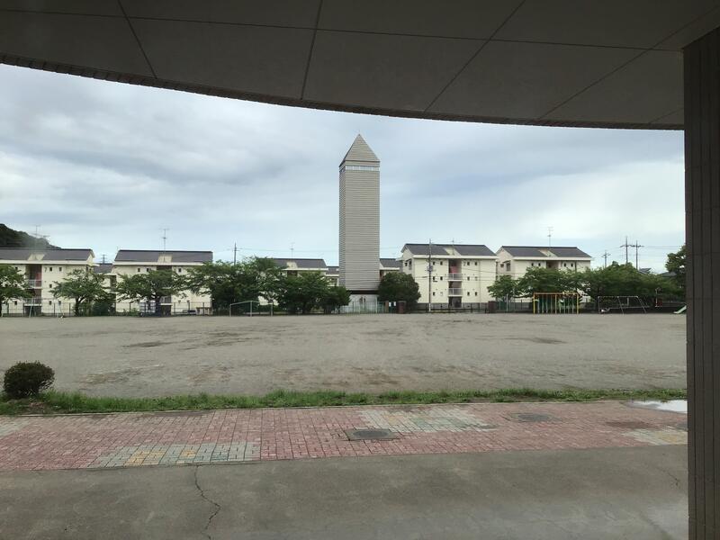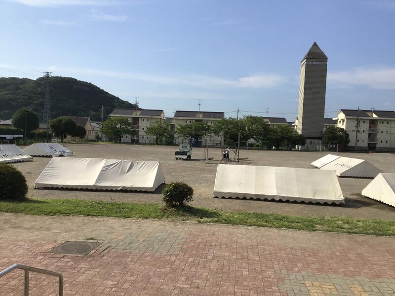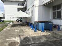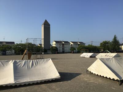 学校の中庭には、工事関係のテントなども立ちました。もうすぐ工事小屋もたつ予定です。夏休みになるとともに第2期トイレリフォーム工事がスタートします。