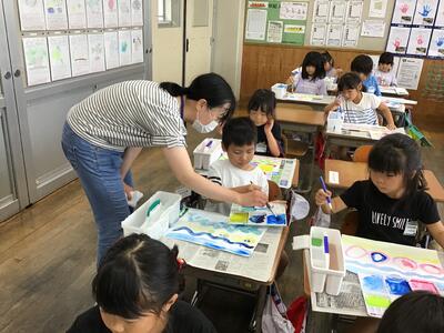 パレットの使い方、絵の具の出し方、水の混ぜ方などを練習しました。