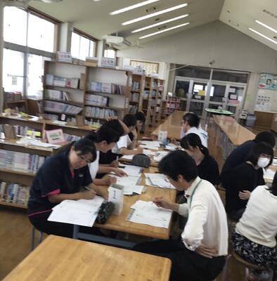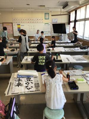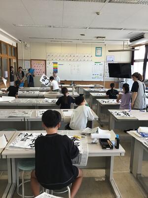 書道チャレンジチームは、下野書道展の作品作りです。学校では使わない紙のサイズに真剣にチャレンジしています。