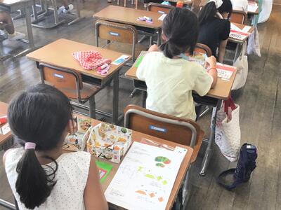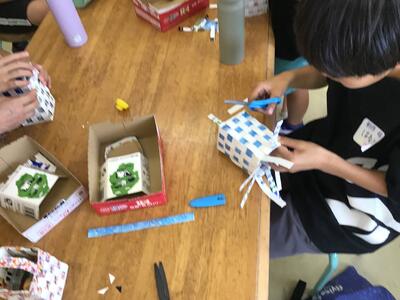 こちらの部屋では、牛乳パックで鉛筆立てを制作するようです。