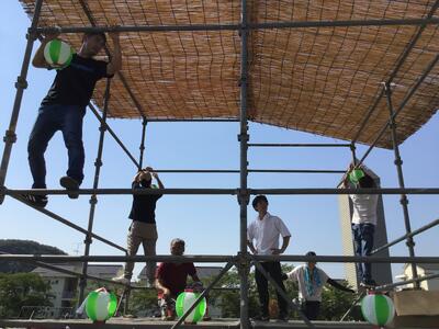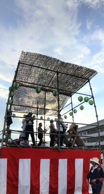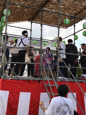 子供たちには、お話の体験もありました。櫓の上で真剣な表情です。