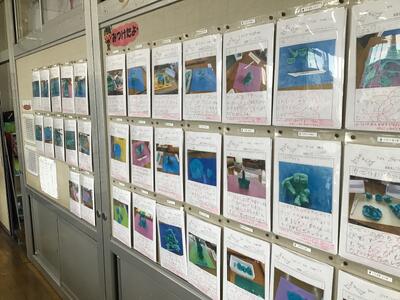 こちらは、図工の作品紹介の掲示物ですが、実物ではなく、自分で撮った写真掲示になっています。撮影する角度などにもこだわりがあるようです。教室の様子も、変わってきているのですね。