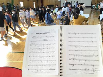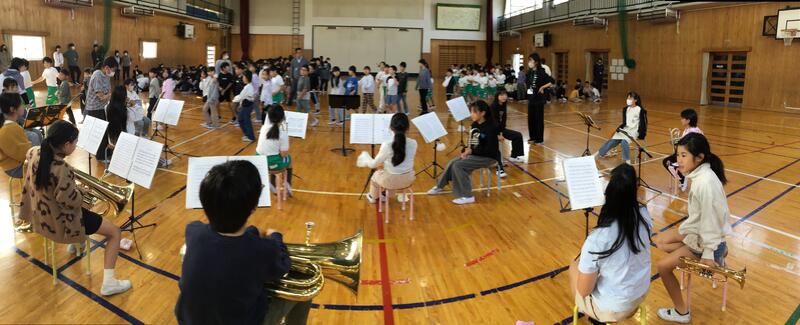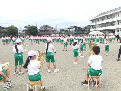 運動会の練習で今日は金管バンドが登場しました。入場の音楽をしっかりと演奏しました。