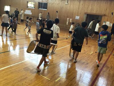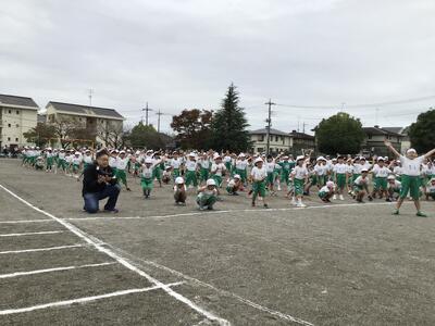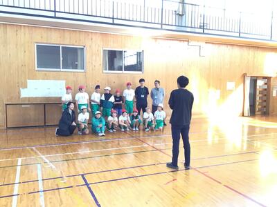 そんな中でも子供たちは、元気に頑張りました。写真は、準備運動の1つとして行う「からだジャンケン」です。
