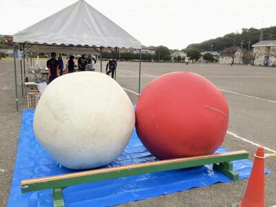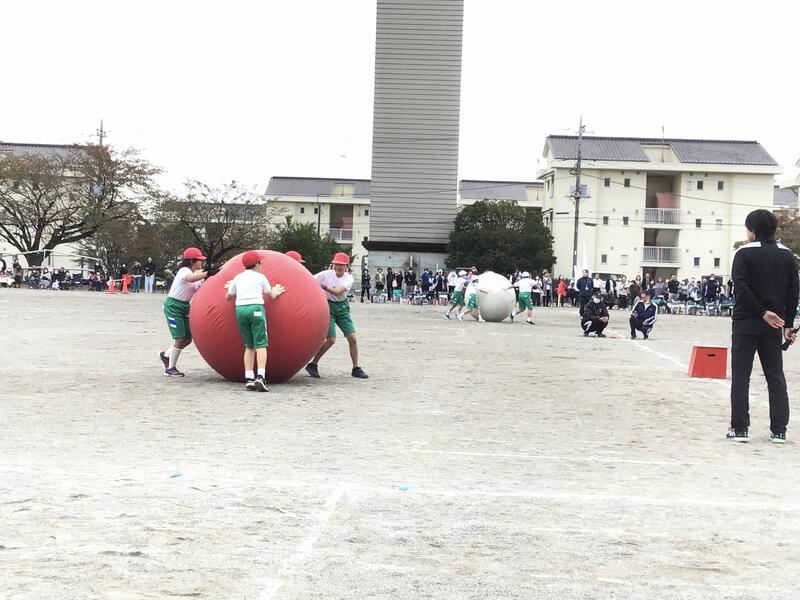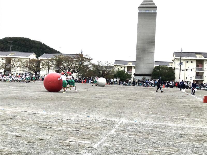 5,6年生の団体競技は、見応えがあります。背丈より大きな大玉を転がして、