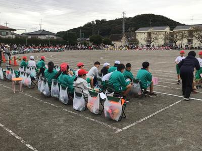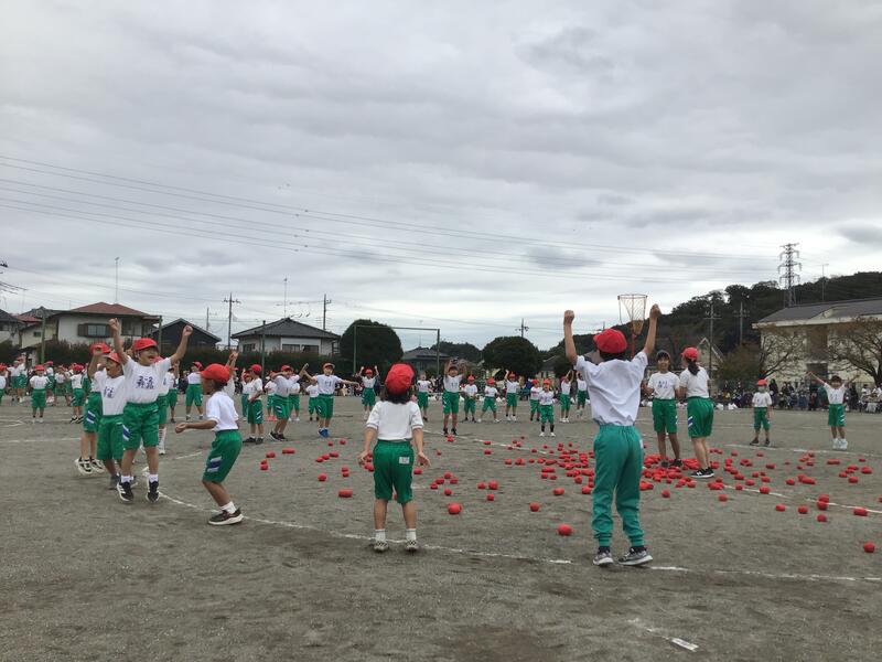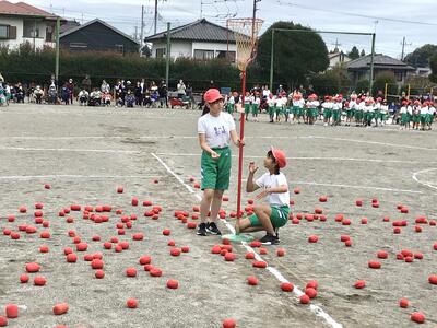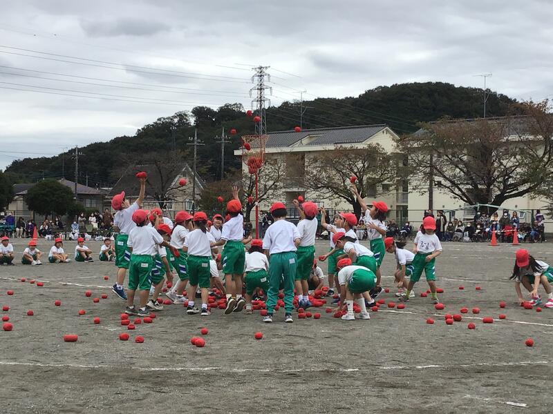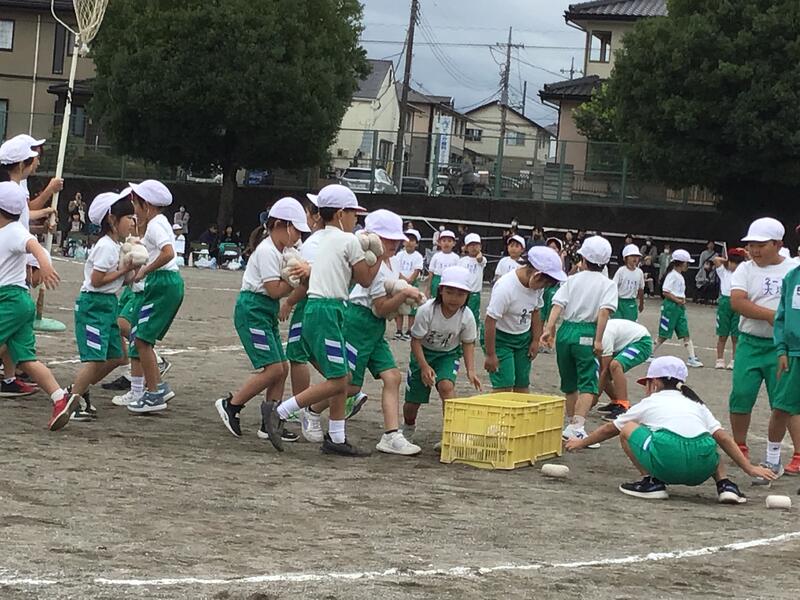 続いて、定番ですね。みんながやりたい「紅白玉入れ」1,2年生の団体競技です。