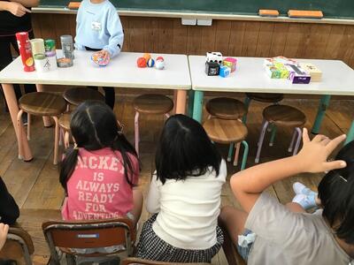 算数の授業でした。箱の形の仲間分けの学習のようです。