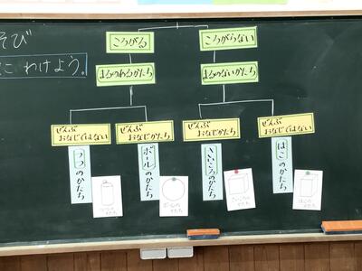 仲間分けには、分類の視点が必要です。ここでは、「ころがるかどうか」「まるのかたちがあるか」などが分類の視点になっているようです。