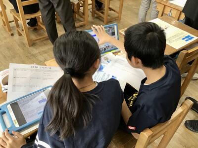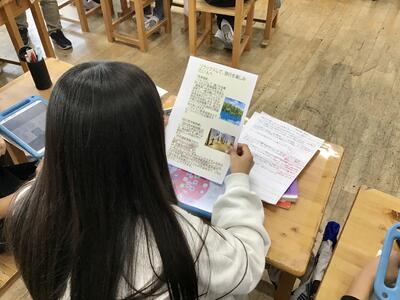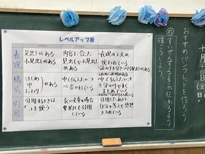 6年生国語の研究授業です。「読む人を引きつけるようなパンフレットを作ろう」をねらいにして、班でテーマを考え、それぞれが書く材料を取材しパンフレットの制作を続けてきました。