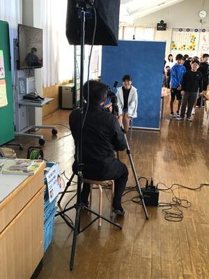 図書室が写真スタジオに早変わりしています。みんないい笑顔です。