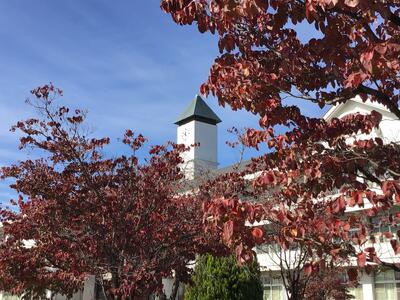 校庭のハナミズキは美しく紅葉して時計塔と青空とベストマッチです。