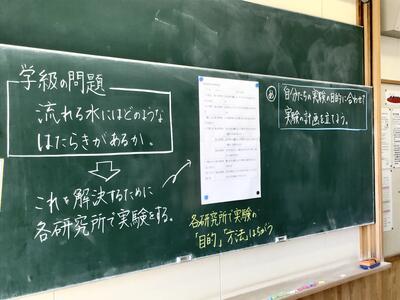 「流れる水の働き」の授業のようです。「流れる水」にはパワーがあります。どんな働きがあるのか、グループごとに課題をもって解明していこうとする内容です。