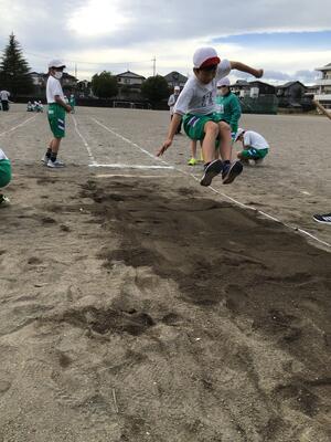 遠くへ跳ぶのがねらいですが、高く跳ぶ意識をもった方が距離は伸びるものです。