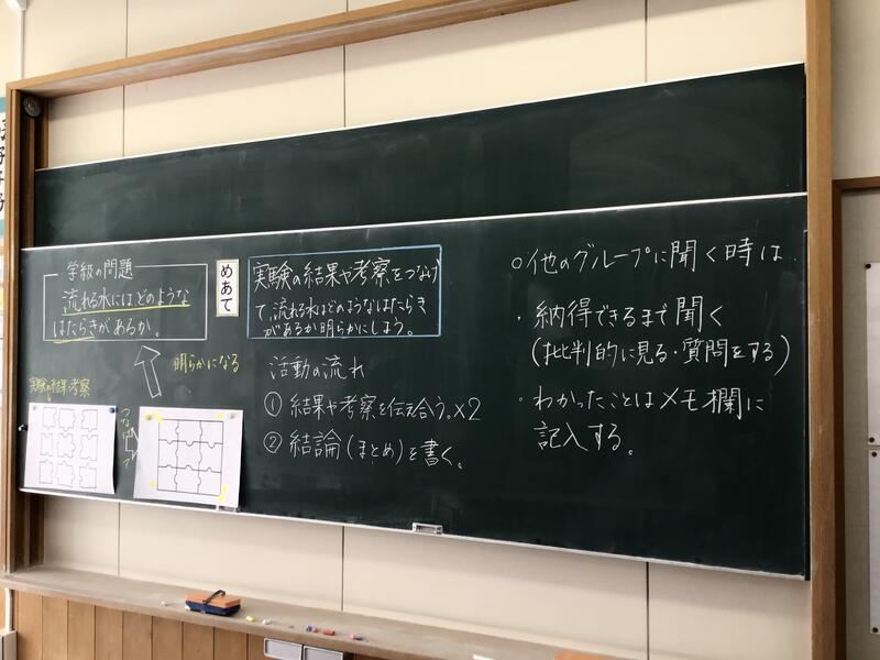 今日はその結果(それぞれが得た知識)を伝えあって、「流れる水の働き」の全容をまとめようという時間でした。