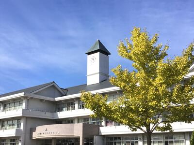 秋晴れです。校庭のイチョウも黄色く色づき、青空に映えています。