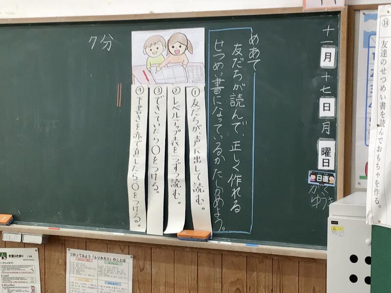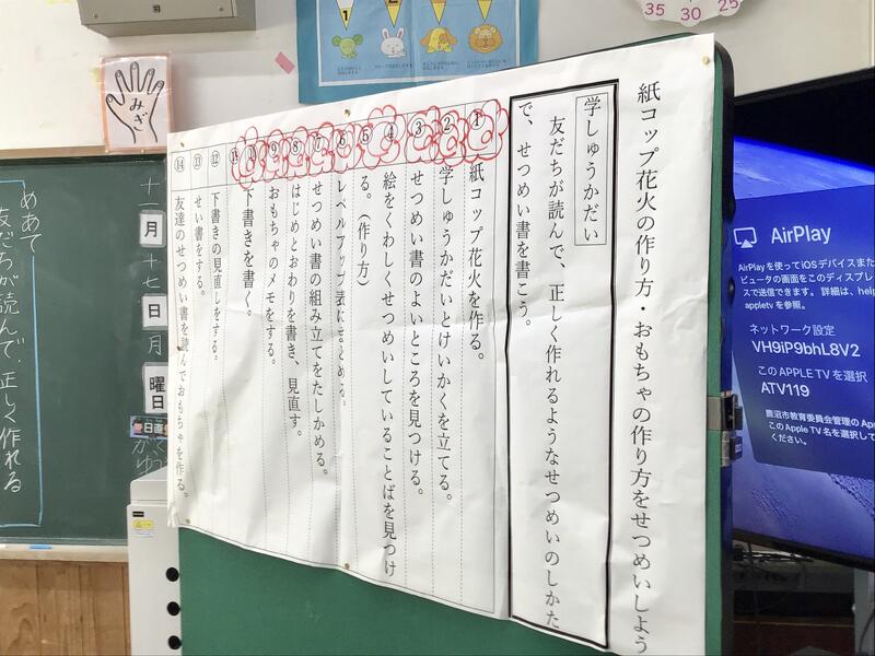 6年生と同じように文章を書くことが、本単元でのテーマになります。「紙コップ花火の作り方・おもちゃの作り方をせつめいしよう」ということで、自分が作ってみたおもちゃの制作説明書を作っています。