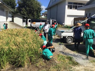 いつもお世話になっている稲作指導ボランティアの先生に刈り取り方、まとめ方を教えていただいて、早速、収穫開始です。