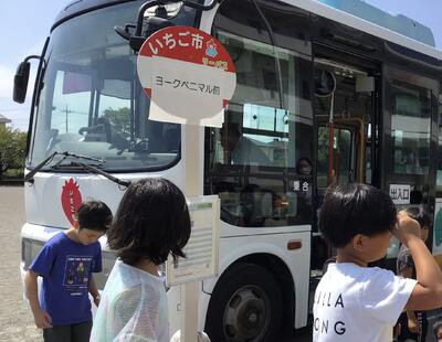 きれいなバスですね。イチゴをモチーフにしたデザインで鹿沼市をアピールしています。