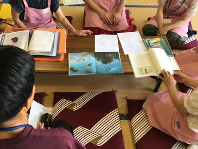 今日は、2〜5学年主任と国語の授業と関連した読み聞かせの打ち合わせをしています。