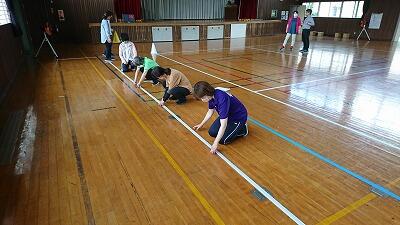 給食後、1~5年生が下校した後、6年生が明日の入学式の準備をしました。