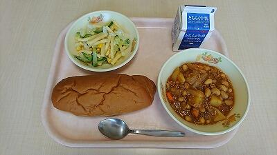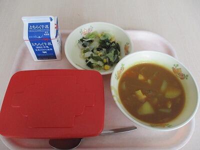 6月1日の献立は、大麦ご飯、シーフードカレー、わかめサラダ、牛乳でした。