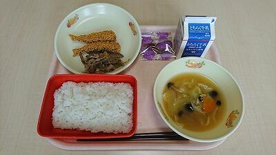 今日の献立は、カミカミ献立で、ご飯、いわしのカリカリフライ、豚肉とゴボウの時雨煮、味噌汁、果汁グミ、牛乳でした。