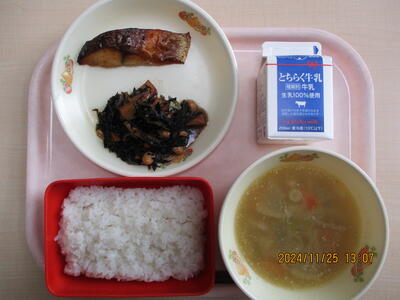 献立は、ご飯、牛乳、ブリフライ、切干大根の煮物、どさんこ汁でした。