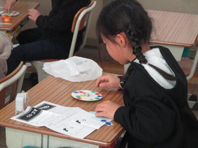 赤・青・緑・黄色のシールを貼って、好きな模様を作りました。