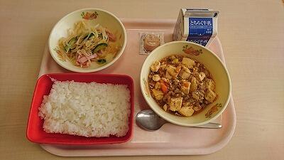今日の献立は、ご飯、麻婆豆腐、キムチ和え、型抜きレアチーズケーキ、牛乳でした。