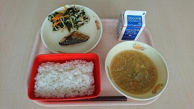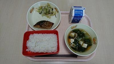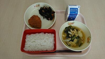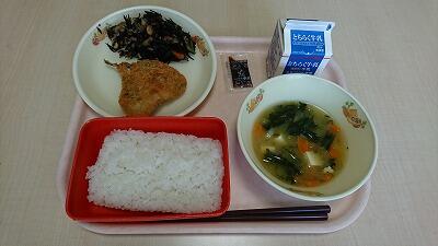 今日の献立は、ご飯、あじフライ、五目煮、小松菜の味噌汁、牛乳でした。