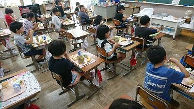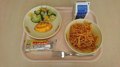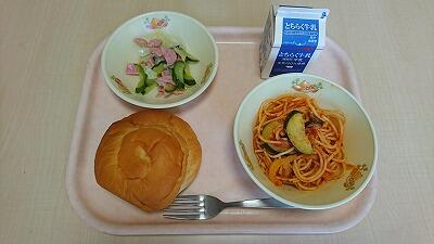 今日の献立は、夏野菜のスパゲッティ、ハムマリネサラダ、ミニミニはちみつパン、牛乳でした。