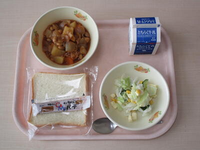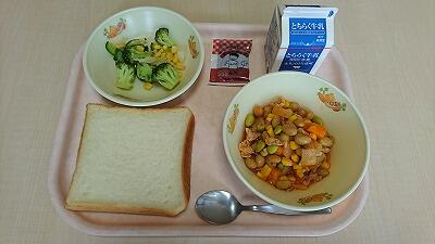 今日の献立は、食パン、チョコクリーム、ポークビーンズ、イタリアンサラダ、牛乳でした。